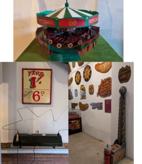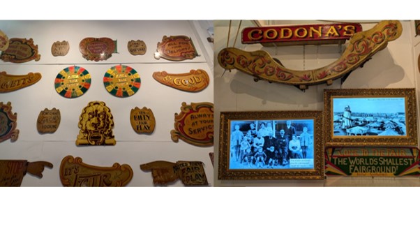 As visitors enter the space, they encounter historic fairground signage as well as decorative timbers from Tom Clarke’s swing boats that have been incorporated into the display.