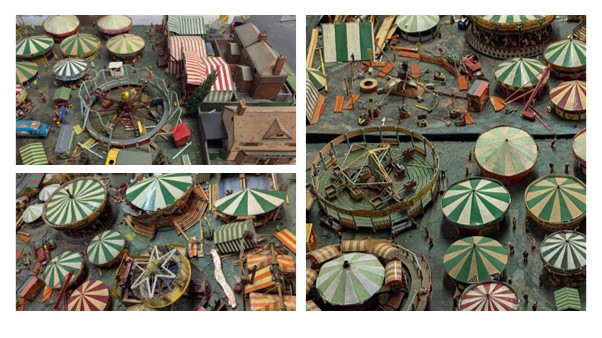 In addition to acquiring new items for the exhibition, we also sought to integrate existing related and hidden collections, including a large fairground model built by two brothers- Jon and Ken Tarleton- from Redditch. The various rides and attractions pictured are made from everyday, recycled household items, including cardboard packaging and tin cans. They depict rides from the 1880s to the 1960s, many which were seen by the brothers whilst visiting fairs throughout the Midlands.