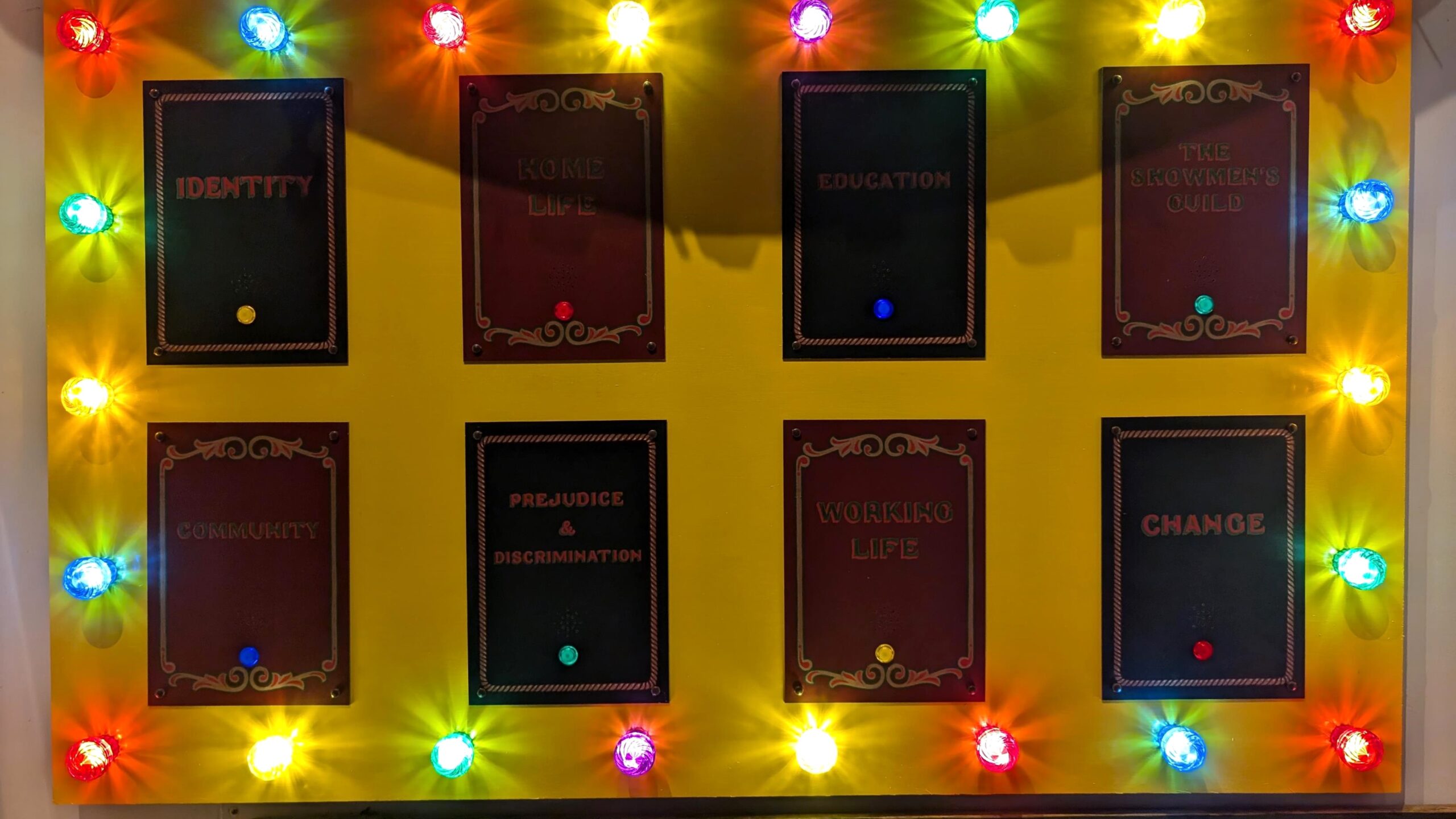 Another standout feature of the exhibition is the oral history section. The eight themes on displayed on the panel below, which include identity, community, and discrimination and prejudice, contain personal and powerful stories from 25 members of the Showmen community . The panels contain in-built speakers, and at the press of a pulsating button, one of these stories are played at random.