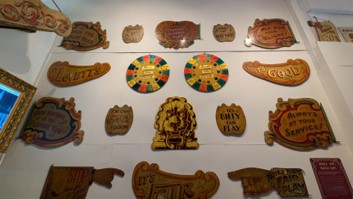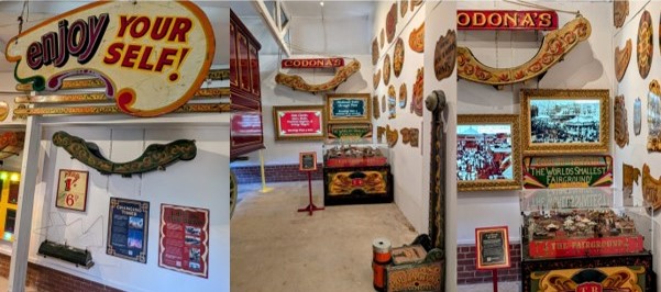 Many of the signs loaned from the Fairground Heritage Trust have been used to form a display wall of gag tags, which is particularly impactful, and an AV section displays a slideshow of archival images from both our collection and the National Fairground and Circus Archives’. One which displays many previously inaccessible images of Tom Clarke, his wagon, rides, and fairs, and the other on Midlands fairs through time.